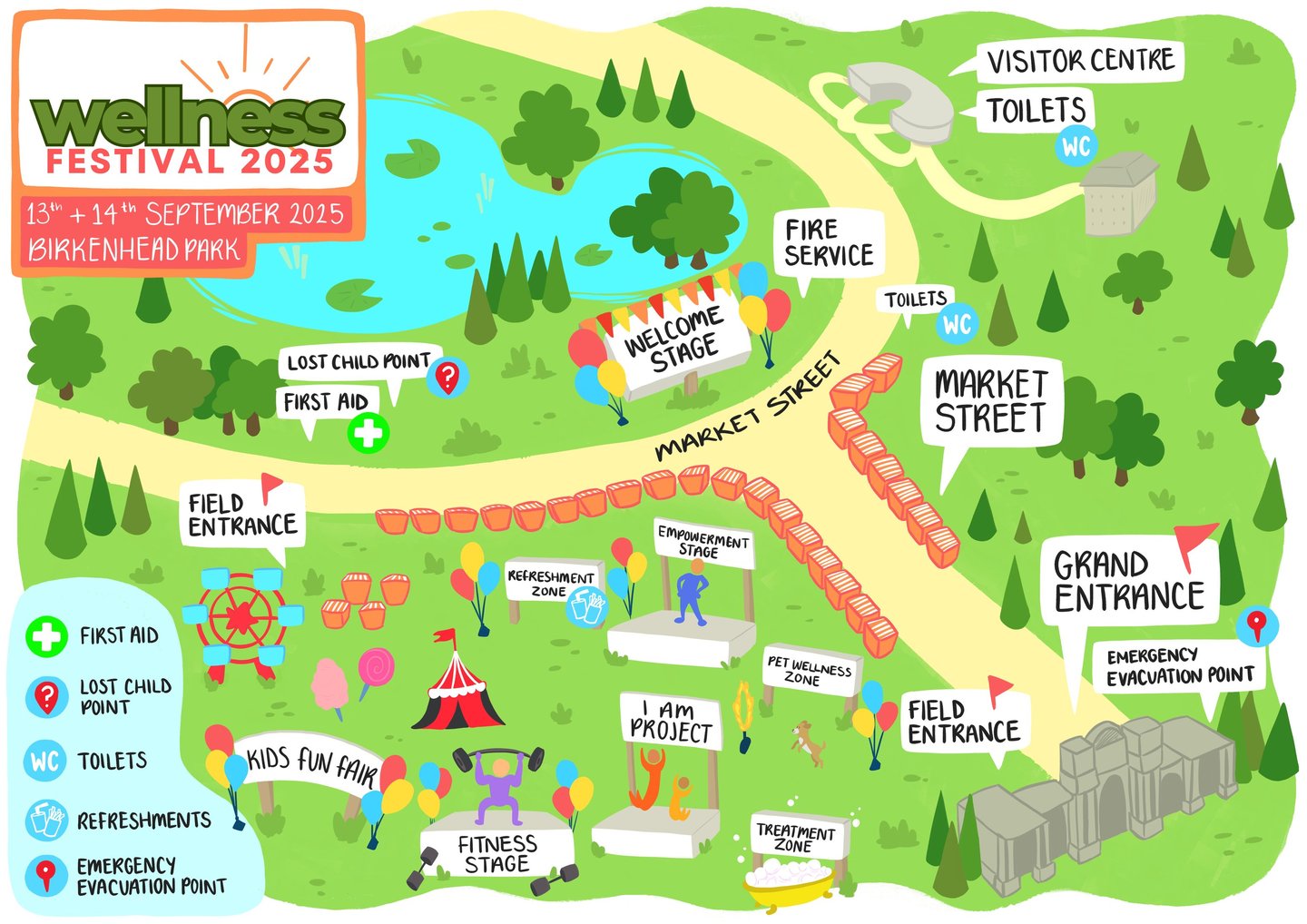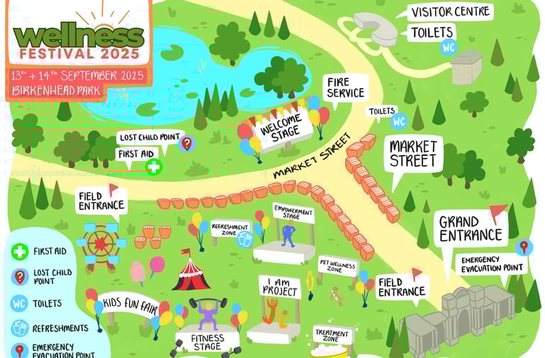 You send me some info like the venue, the things you want on the map, and your branding, and I turn it into an easy to read, fun and visual sitemap, like this one I did for the Wirral Wellness Festival! Read what they thought of it below ✨